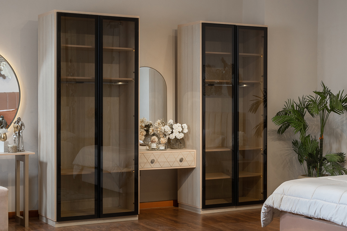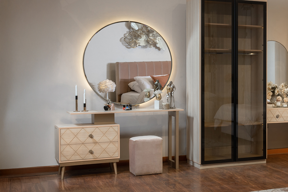 The Malika Bedroom Set combines elegance with functionality. It features a 160 cm bed, commodes, a wardrobe, and a dresser with pouf—designed for a refined and spacious atmosphere.