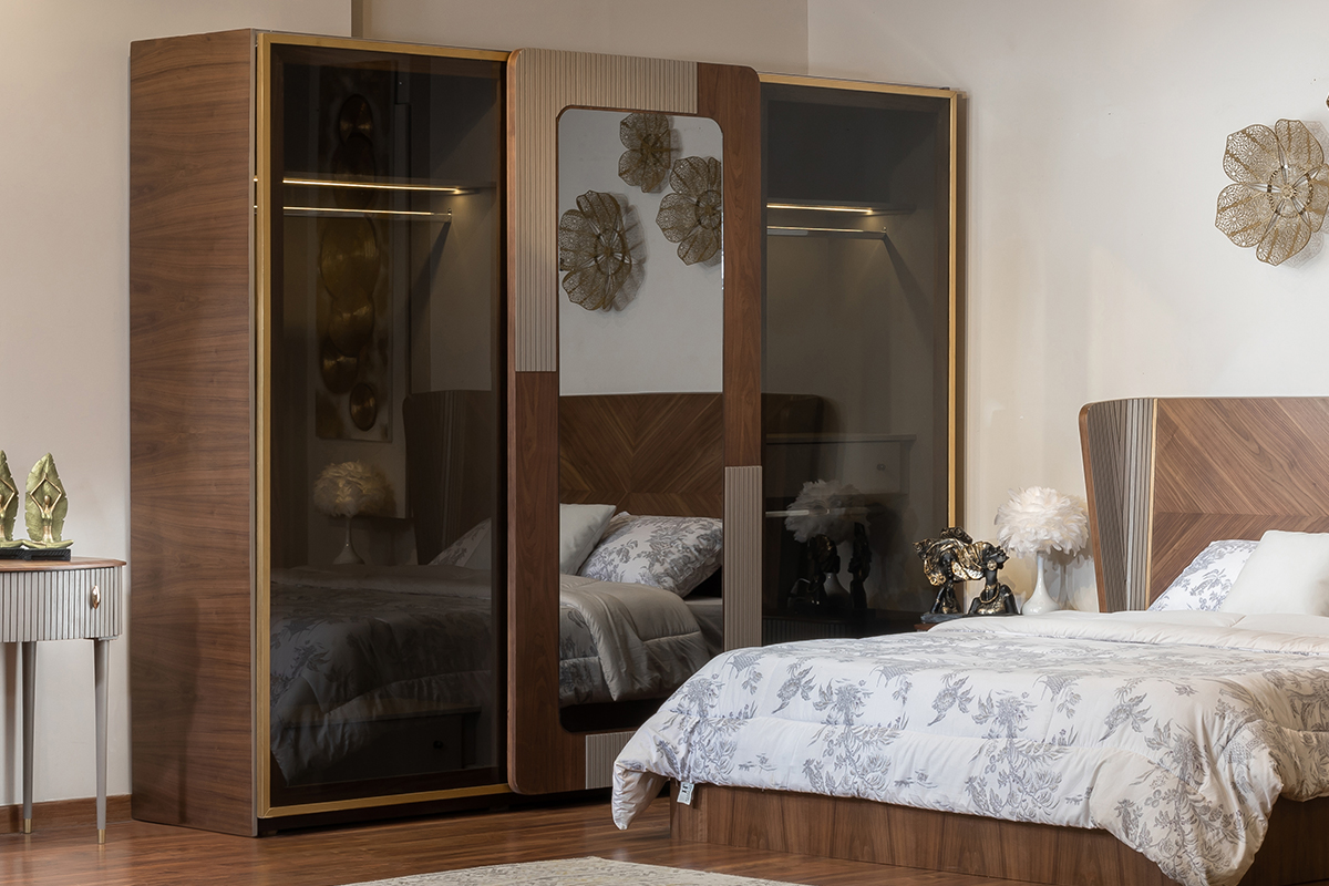 Designed with meticulous craftsmanship, the frames of this bedroom set are crafted from premium red oak, complemented by walnut veneer surfaces. The ensemble includes a 180 cm bed, two nightstands, a dressing table, and a 280 cm wardrobe. Customize the upholstery, color, and dimensions to seamlessly blend with your style and space preferences.