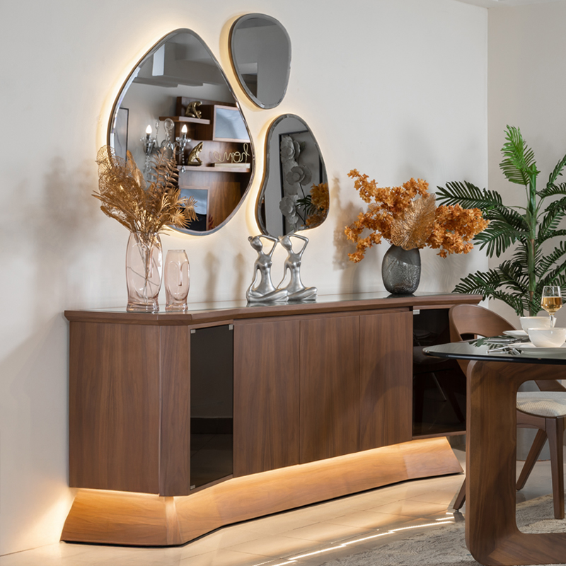The Alexa Dining Set is a refined blend of elegance and functionality, designed to elevate your dining experience. With a beautifully crafted table, plush chairs, a spacious buffet, and three decorative mirrors, this set brings timeless sophistication and practicality to your dining room.