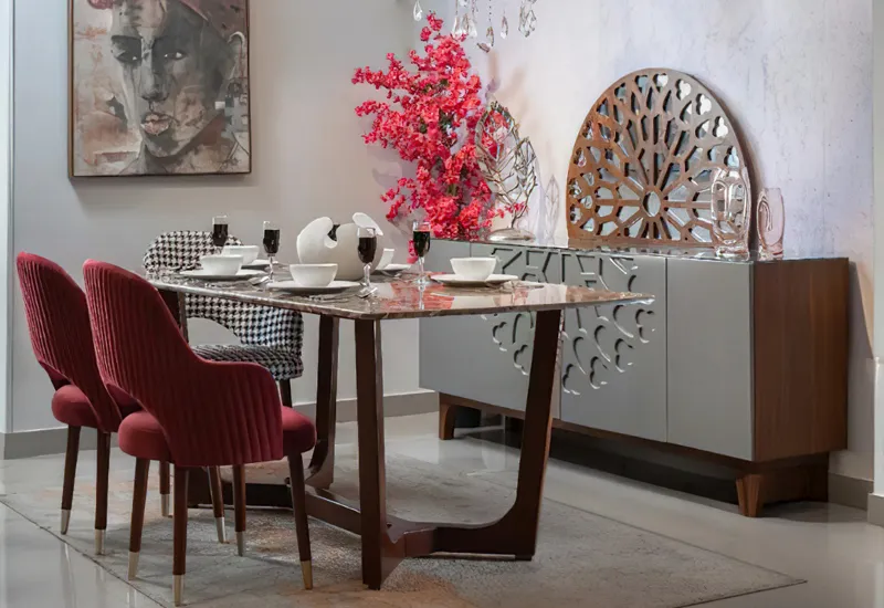 The Royal Dining Set is designed to add a touch of classic elegance to your home. With a spacious table, six comfortable chairs, a refined buffet, and decorative mirrors, this set creates a sophisticated dining atmosphere perfect for both daily use and special gatherings.