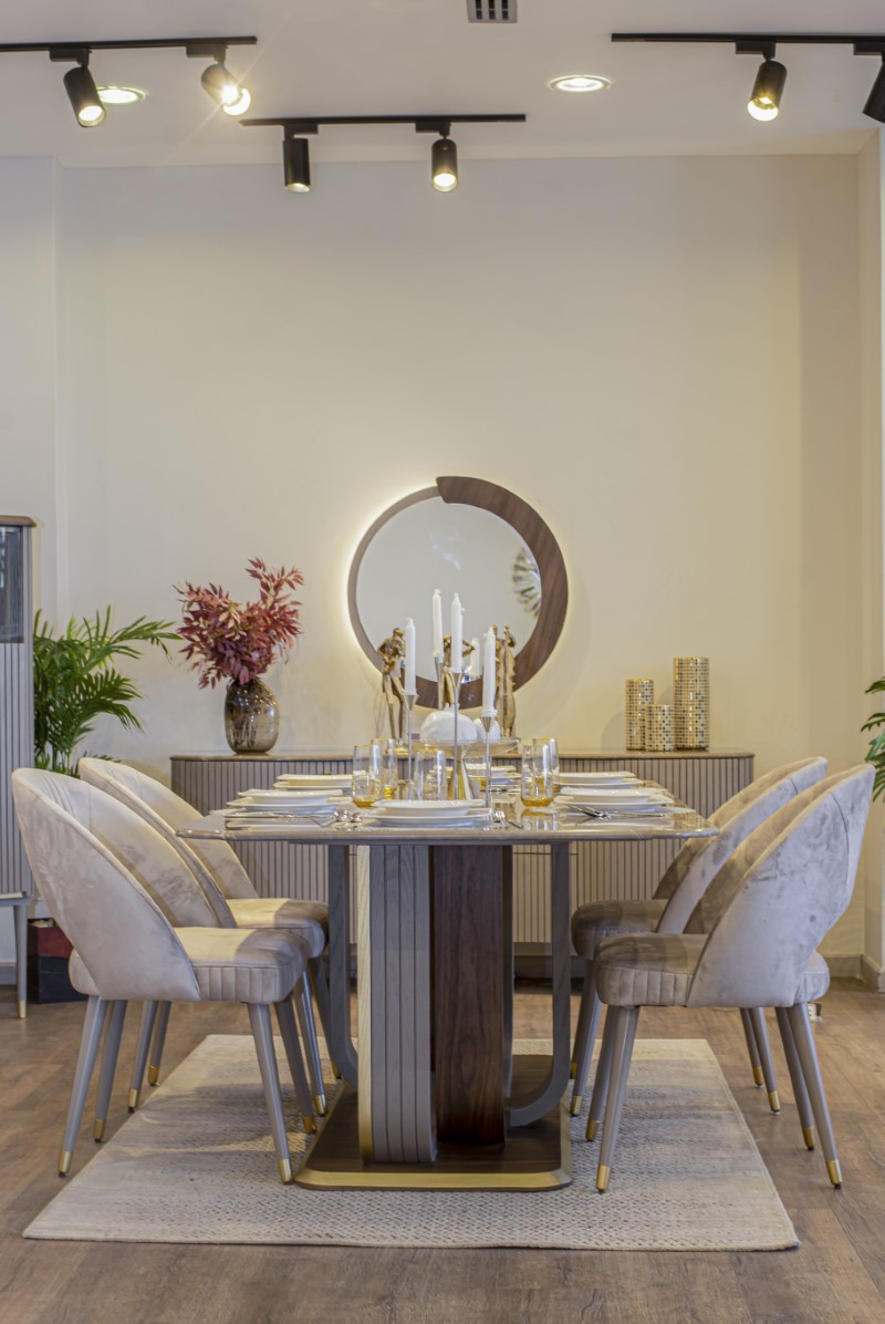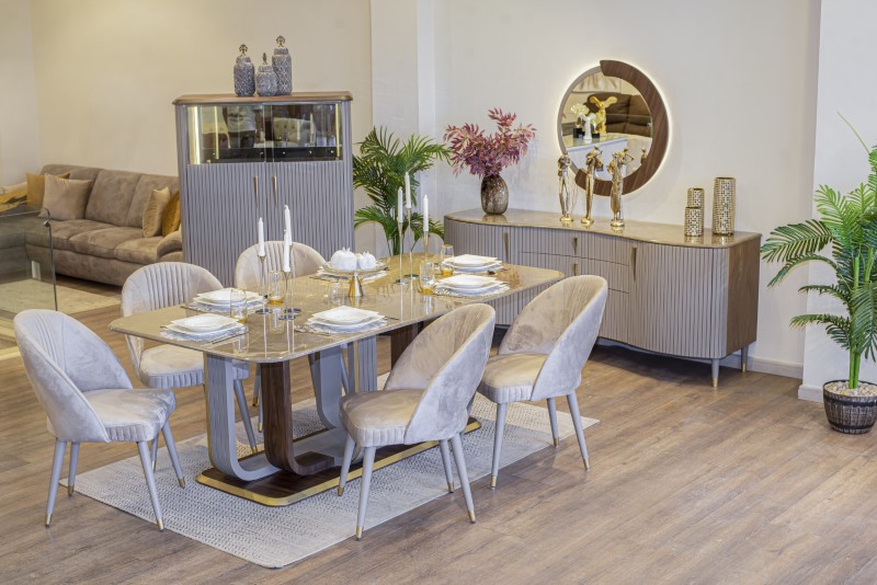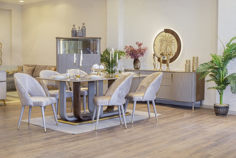 The Thoraya Dining Set is a true centerpiece of elegance and luxury. Designed with a spacious table, six finely upholstered chairs, a grand buffet, and decorative mirrors, it transforms your dining room into a space of sophistication and comfort—ideal for formal dinners and family occasions alike.