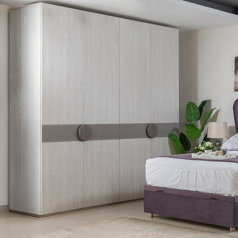 إطارات من خشب البلوط الأحمر مزينة بفسيفساء من قشرة الجوز الطبيعي والماهوجني والروزوود والقيقب، تزيّن طقمًا متكاملًا يضم سريرًا بعرض 120 سم، و2 كومود، وتسريحة مع مرآة، ودولاب بعرض 240 سم، ليقدم تناغمًا رائعًا من ألوان الخشب في غرفة نوم تجمع بين الفخامة والانسجام.
