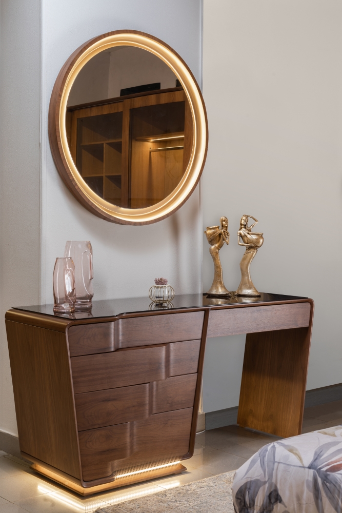 Elevate your bedroom with timeless elegance - red oak wood frames enriched with natural Turkish walnut veneer adorn a set comprising a 180 cm bed, 2 nightstands, a dressing table, and a 280 cm wardrobe, offering a luxurious blend of craftsmanship and sophistication.