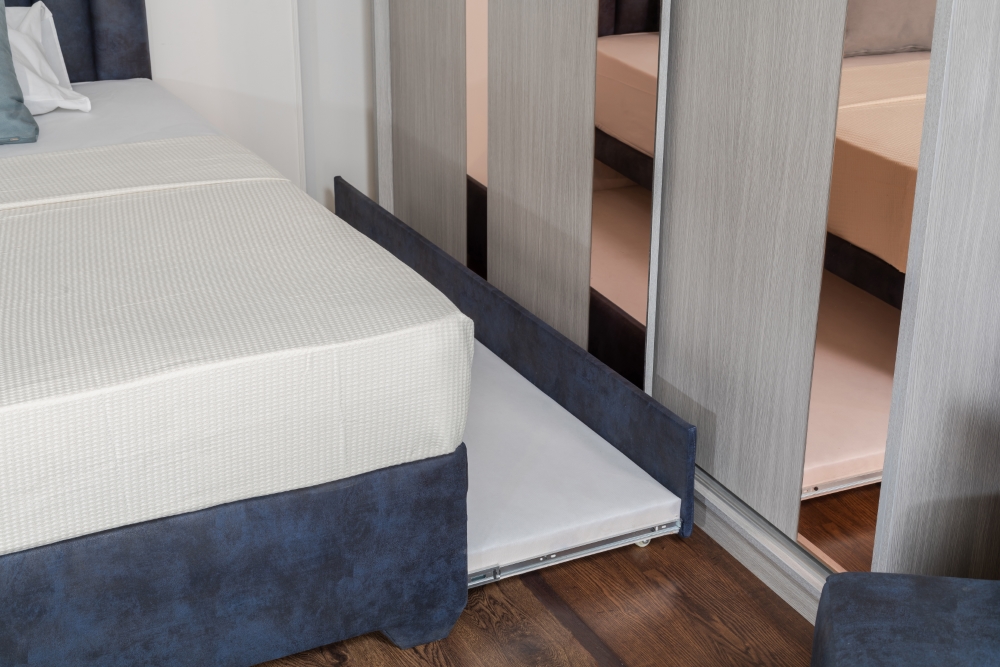 Our frames boast the rich allure of red oak wood, complemented by the elegance of natural walnut veneer gracing their flat surfaces. This set includes two comfortable 120 cm beds, a convenient nightstand, a stylish dressing table, and a spacious 280 cm wardrobe. It's a complete package that brings both warmth and functionality to your space.