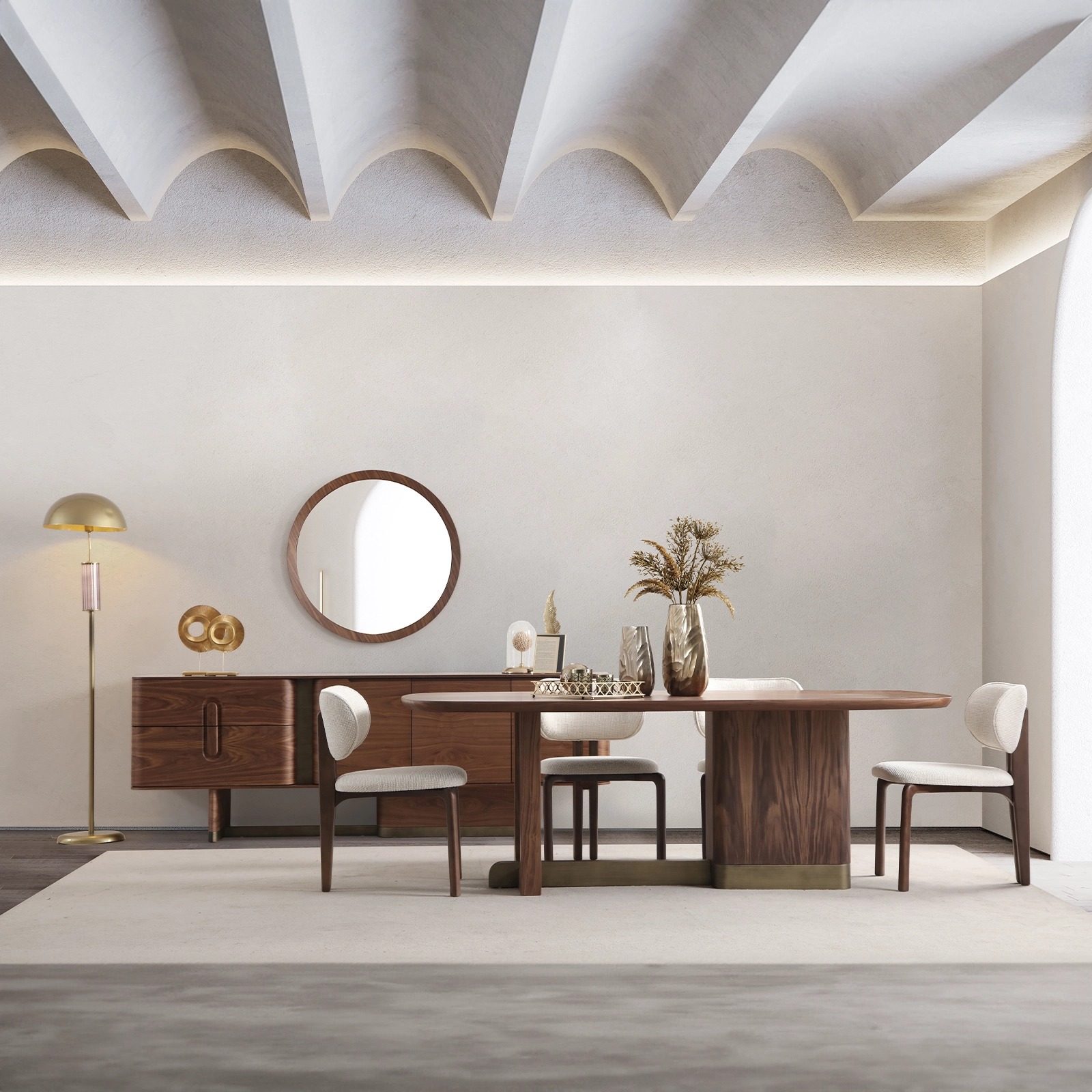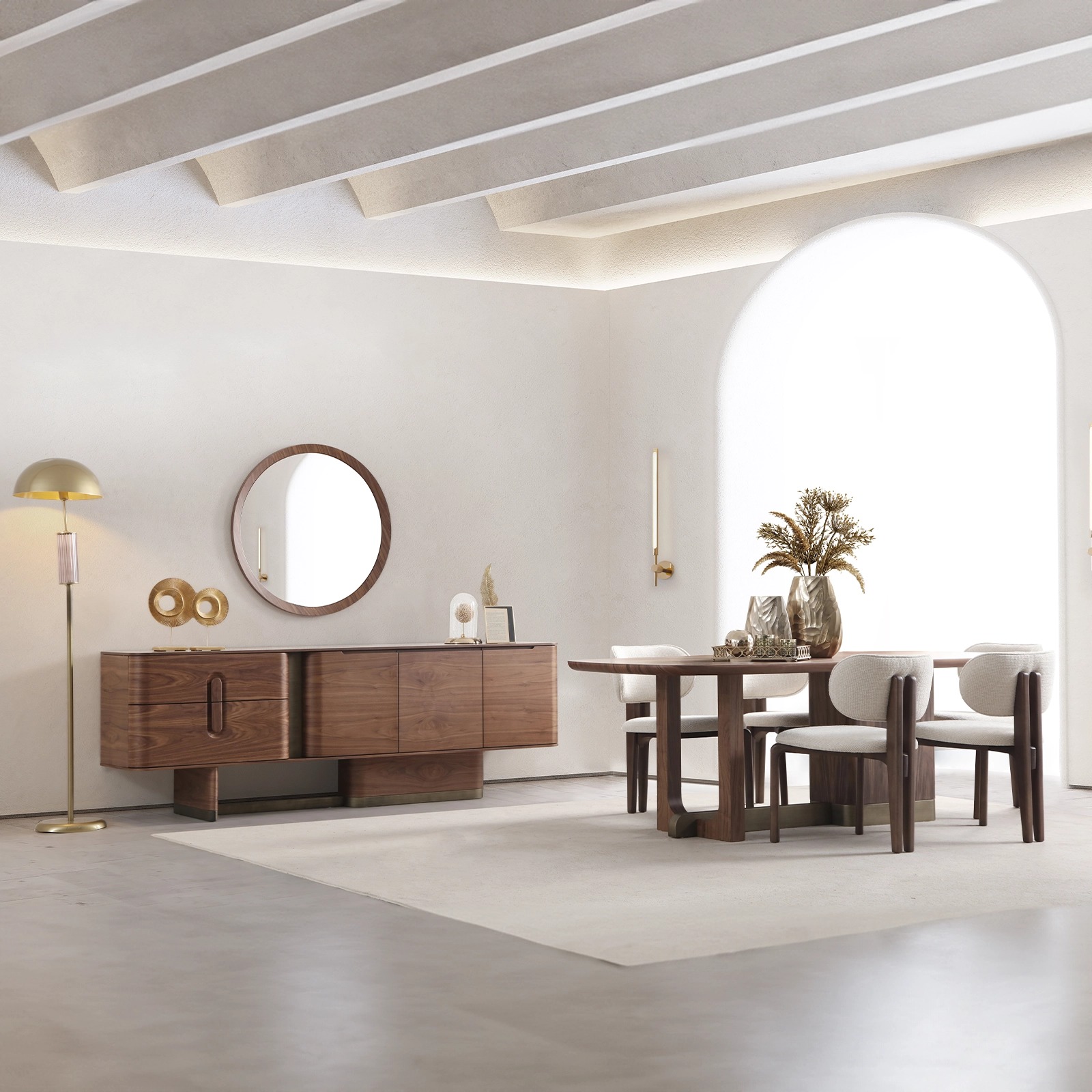 طقم سفرة يعمج بين الفكامة الكلاسيكية و العملية يتميز بطاولة واسعة و بوفيه انيق و 6 كراسي و مرايا عصرية